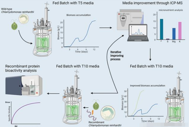 微藻已被確定為生產(chǎn)高質(zhì)量生物質(zhì)和后續(xù)生物產(chǎn)品(如食品、飼料、營養(yǎng)補充劑、重組蛋白和生物燃料)的替代平臺。治療性蛋白質(zhì)的傳統(tǒng)生物技術(shù)宿主,如大腸桿菌和哺乳動物CHO細(xì)胞,早已被確定為主要平臺,但最近的研究進展表明,微藻可能成為一種替代平臺。在本研究中,我們研究了萊茵衣藻在高密度異養(yǎng)培養(yǎng)中生產(chǎn)復(fù)雜人類重組蛋白的潛力。重組人蛋白ICAM-1的目標(biāo)是使用補料分批策略從生物反應(yīng)器中生長的細(xì)胞分泌到培養(yǎng)物的細(xì)胞外培養(yǎng)基,以實現(xiàn)高細(xì)胞密度。最終,這導(dǎo)致最大生物量滴度為40 g/L,重組蛋白滴度為50 mg/L。通過對其天然配體LFA-1的結(jié)合測定,藻類產(chǎn)生的ICAM-1蛋白顯示出與哺乳動物細(xì)胞培養(yǎng)產(chǎn)生的ICAM-1相當(dāng)?shù)纳锘钚?。這項工作表明,萊茵梭菌是使用補料分批異養(yǎng)生長策略在高濃度下生產(chǎn)具有天然生物活性的復(fù)雜重組蛋白的可行選擇。
