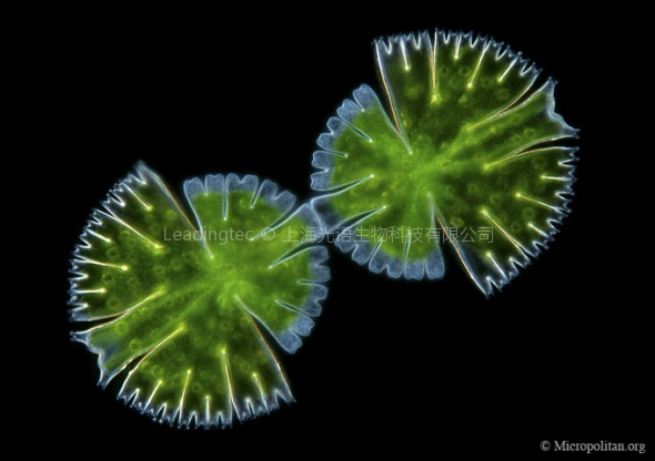 硅藻最令人稱奇的是那一對硅質瓣殼,一只硅藻通常標配兩塊瓣殼,它倆一大一小相互扣合保護住細胞質,同時又保證有充分的光線透過。而每一瓣殼上都會有放射狀花紋,如果這只硅藻是圓盤狀的小環(huán)藻,那這個花紋通常呈中心放射狀,如果藻是舟形或是桿狀的,那殼的縱向會看到一條軸,花紋呈軸對稱分布。分裂繁殖的時候,上下兩半殼分道揚鑣,分裂出的兩只細胞再分別為它們合成出有著同樣精細花紋的另一半。這些小玻璃工藝品上漂亮的圖案在普通光學顯微鏡下并不明顯,但若將光源設為暗背景,通過多彩的折射光就能看到它們的精巧紋身。