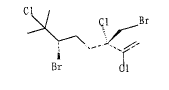 Halomon(圖6)是從松香藻(Portieria hornemannii)中提取的多鹵化單貼化合物,從不同產(chǎn)地的P.hornemannii中已發(fā)現(xiàn)Halomo類似物10多個。其對腫瘤具有選擇性活性,如對黑色素瘤、P388和L1210的IC50僅為腦腫瘤、腎腫瘤和克隆腫瘤的0.001。藥理研究表明該化合物具有獨特的作用機制,參與小鼠及人的肝細胞色素P450酶的代謝,而且對通常不敏感的癌細胞系具有選擇性活性[21]。它是Boyd小組于1992年首次分離的抗腫瘤成分,目前已進入臨床前藥理評估階段[22、23]
