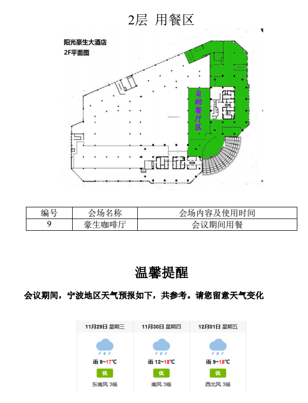 1.本次會(huì)議地點(diǎn):寧波陽(yáng)光豪生大酒店(寧波海曙區(qū)中山西路1288號(hào))。會(huì)場(chǎng)區(qū)、海報(bào)展區(qū)及用餐區(qū)分別分布在酒店2-3層,敬請(qǐng)留意指南中的地方說明及會(huì)場(chǎng)分布圖。