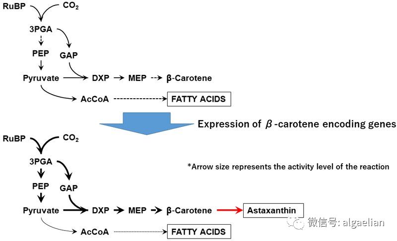 Hasunuma教授等人開發(fā)的動態(tài)代謝譜方法用于分析蝦青素生產(chǎn)過程中細(xì)胞內(nèi)的代謝。該分析揭示了磷酸鹽組分的增加,特別是脫氧木酮糖5-磷酸酯(DXP)、甘氨醛3-磷酸酯(GAP);和甲基羥色胺醇4-磷酸酯。此外,中間脫氧木酮糖5-磷酸(DXP)在非代謝途徑(蝦青素生產(chǎn)的前體代謝途徑)中的水平也增加了(圖3)。體內(nèi)碳標(biāo)記顯示,β-胡蘿卜素編碼基因的表達(dá)增強(qiáng)了中樞代謝中的碳流。
