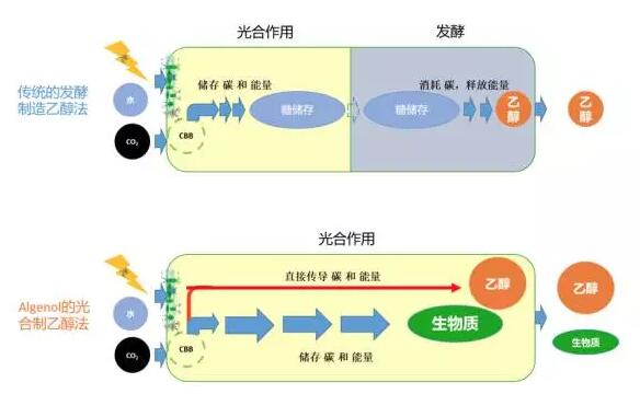 藍(lán)藻可以通過(guò)光合作用吸收外界的二氧化碳生成糖分儲(chǔ)存于體內(nèi),然后在無(wú)光無(wú)氧的情況下進(jìn)行發(fā)酵。一些藍(lán)藻可以在發(fā)酵過(guò)程中生成少量的乙醇,釋放出來(lái)。然而,發(fā)酵產(chǎn)生乙醇的方法產(chǎn)量低,速率慢,并不經(jīng)濟(jì)。
