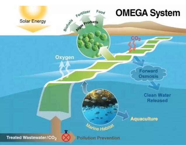 污水處理完畢后,污水可以排入外部水體,而藻類可以用于多種用處,包括生物柴油、肥料、飼料等。這個(gè)系統(tǒng)被命名為OMEGA,即Offshore Membrane Enclosures forGrowing Algae 。