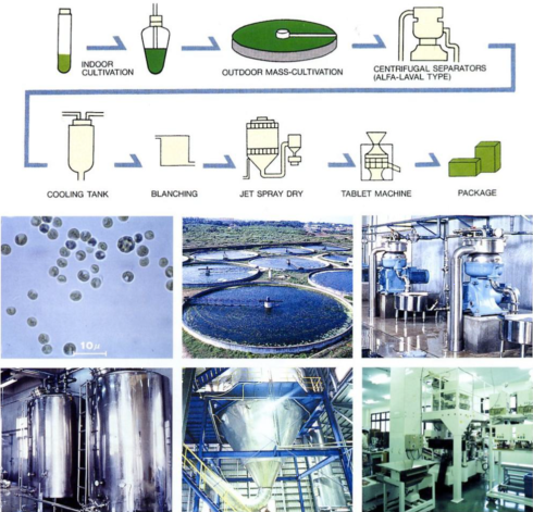 圖5.八重山的小球藻養(yǎng)殖工藝,首先進(jìn)行種子液的培養(yǎng),然后在圓池中進(jìn)行放大培養(yǎng),以碟片式離心機(jī)進(jìn)行濃縮,濃縮液冷卻后(抑菌)進(jìn)行短暫的加熱處理(滅菌及滅葉綠素酶酶活),進(jìn)行噴霧干燥后即可進(jìn)行壓片等后續(xù)加工。(破壁的工藝有幾種可選,如對濃漿進(jìn)行碾磨或高壓均質(zhì),對干粉進(jìn)行氣流對撞等)