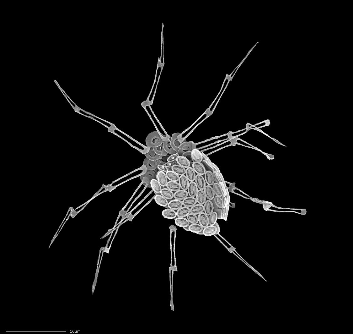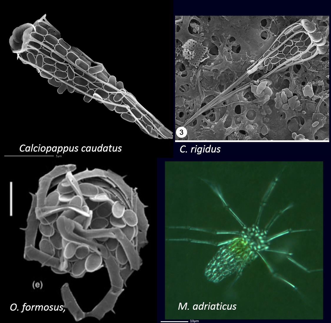 M. elegans及圖11中幾種長腿的顆石藻均屬于Syracosphaeraceae(條結(jié)球藻科?),另外如該科的屬Syracosphaera,也有類似的顆石連成長鏈的情況。長長的附肢顆石,不僅可以張開,還能夠收攏,甚至盤旋起來,如圖12所示,再看看右下角的M.?adriaticus,要說它是某種原生動物也沒差啊?!