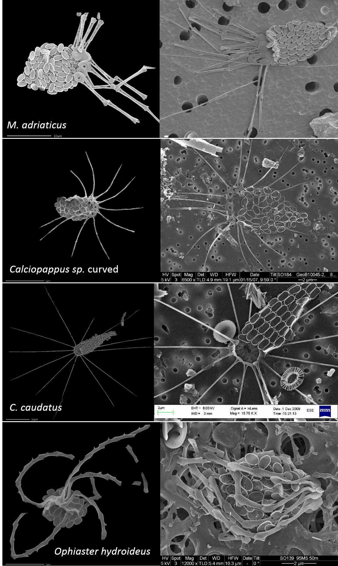 這個圖(圖10.)絕對有星際大片的感覺,微藻一下子從大海走向了星辰。顆石藻M. elegans出現(xiàn)了變異形的顆石,稱為附肢狀顆石,就像蜘蛛的腿一樣。
