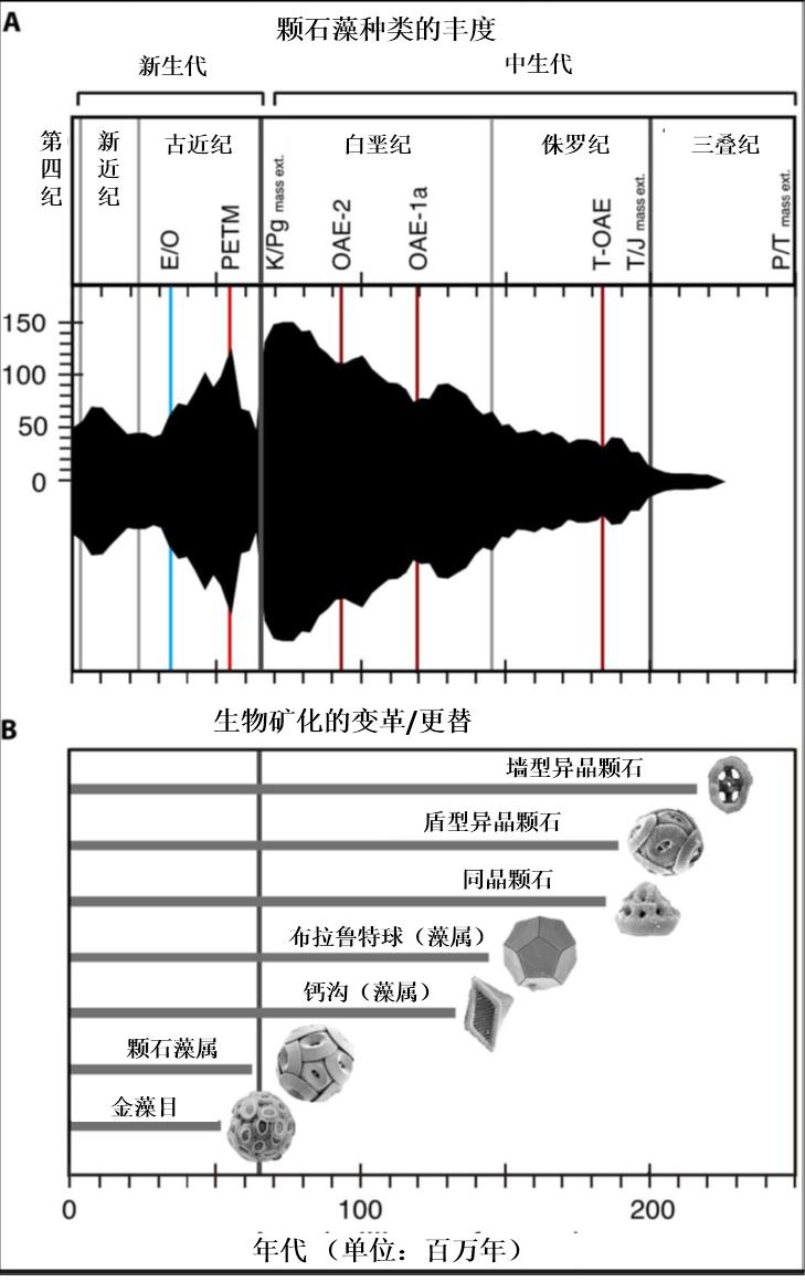 圖13.?顆石藻的進化史(Monteiro et al., 2017)。(A) 顆石藻的種類的豐度。E/O,始新世/漸新世,冰川時代開始;PETM,世極暖時期(古新世/始新世);K/Pg,白堊紀/古近紀;OAE,海洋缺氧事件;T-OAE,托爾階海洋缺氧事件;T/J,三疊紀/侏羅紀;P/T,二疊紀/三疊紀;mass ext,生物大滅絕。 (B) 主要顆石藻生物礦化更替和形態(tài)類群的化石記錄,包括了墻型(異晶)顆石的出現(xiàn)(顆石具有狹窄墻型的環(huán)),盾型(異晶)顆石(盾板互相卡位構(gòu)成結(jié)實的顆石球),同晶顆石(單倍體階段出現(xiàn),微晶體構(gòu)成),布拉魯特球(Braarudosphaera,布拉魯特球藻屬,五邊形的片狀微晶顆石層疊構(gòu)成十二面體顆石球),鈣溝(Calciosolenia,鈣溝藻屬,獨特的菱形墻狀顆石); 顆石藻屬(Coccolithus,豐富而廣泛分布新生代屬種),金藻目(Isochrysidales,主要的顆石藻目屬,包括了Emiliania, Gephyrocapsa和Reticulofenestra等種類),橫線表示重要的生物大消亡事件及古海洋/古氣候事件。