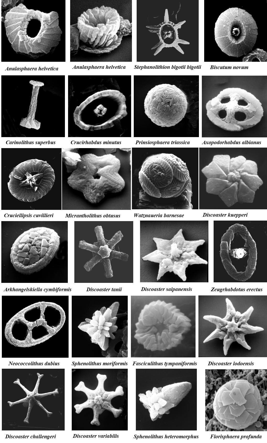 最早的記錄,同晶顆石和異晶顆石分別出現(xiàn)在上三疊紀(~2.25億年前)和下侏羅紀(~1.18億年前),在三疊紀和侏羅紀交界期(約2.05億年前)的物種大滅絕之后,貫穿整個侏羅紀和白堊紀,盡管有物種滅絕現(xiàn)象,鈣質(zhì)微化石的種類還是出現(xiàn)了一個增長,在坎帕階和麥斯里希特階出現(xiàn)了峰值(8000至6800萬年前),然后突然消失了90%的種類(白堊紀-早第三紀大滅絕,隕星撞擊)。有研究認為是隕星撞擊地球,引起了海洋(硫)酸化,從而導致了很多海洋生物的滅絕,相對應的,現(xiàn)代發(fā)生的海洋酸化也已經(jīng)造成了一些海洋鈣質(zhì)浮游生物的死亡,包括顆石藻。