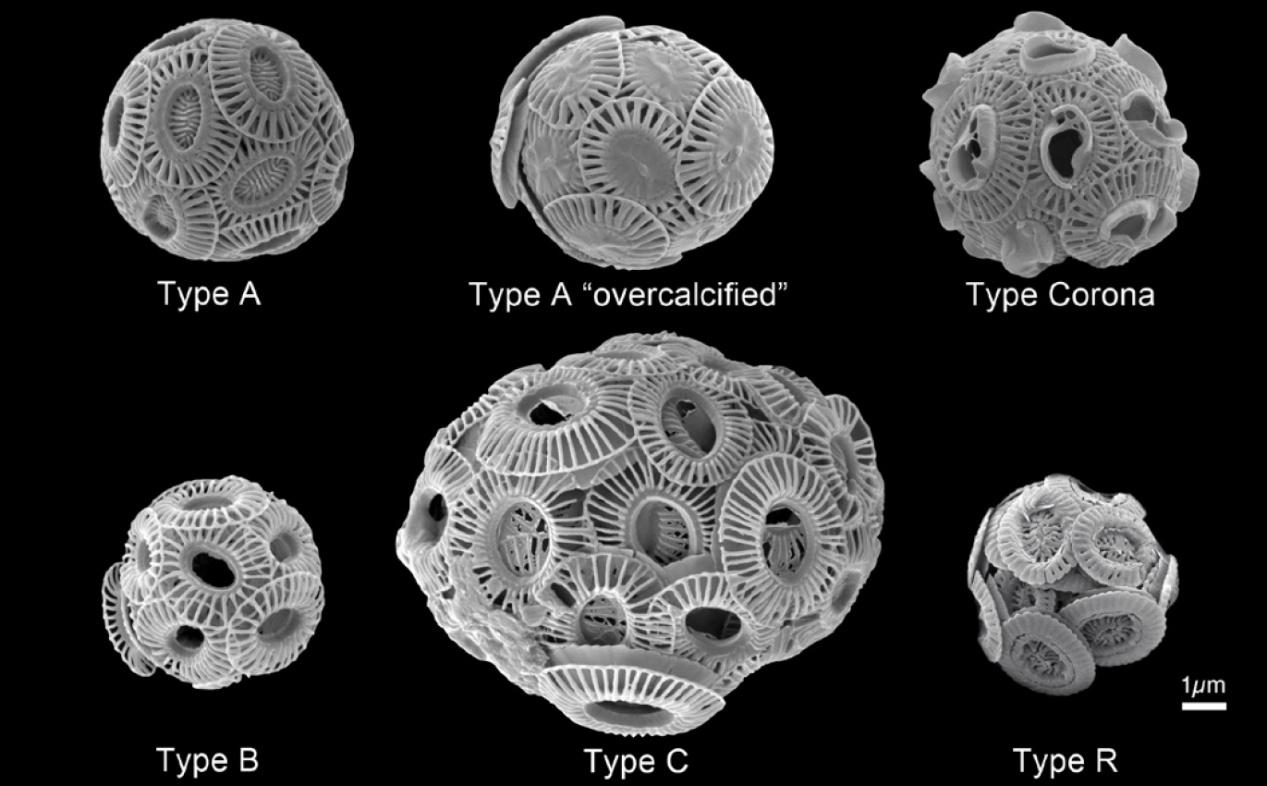 盡管與較早的古近紀和白堊紀相比,這一趨勢導致了今天的主要物種的顆石大小的減少,但現(xiàn)代顆石藻群體仍然保留了大量的顆石結(jié)構(gòu)和細胞形狀。從形態(tài)學上來說,所有的顆石藻都有相同的基本結(jié)構(gòu):外骨骼球團包圍著細胞,但是細胞的形狀有顯著的變化,以及顆石的形狀、結(jié)構(gòu)、晶體結(jié)構(gòu)、數(shù)量,多樣性,以及細胞周圍的排列方式。顆石球的形狀范圍由球形到圓柱形,尺寸從3到30μm不等。每個顆石球上,顆石的數(shù)量從6個到幾百個不等,在單個或多個層面上都有不同,而顆石的形狀從簡單的圓盤狀結(jié)構(gòu)到有裝飾或突出的突出物,包括長刺、喇叭狀和烤架形狀。此外,許多種類只會產(chǎn)生一種單一的顆石,而顆石球是由幾種不同類型的顆石構(gòu)成的。最后,在多倍體生物礦化模式中有一些變化取決于它們所產(chǎn)生的“單倍-雙倍體”生命周期的階段。