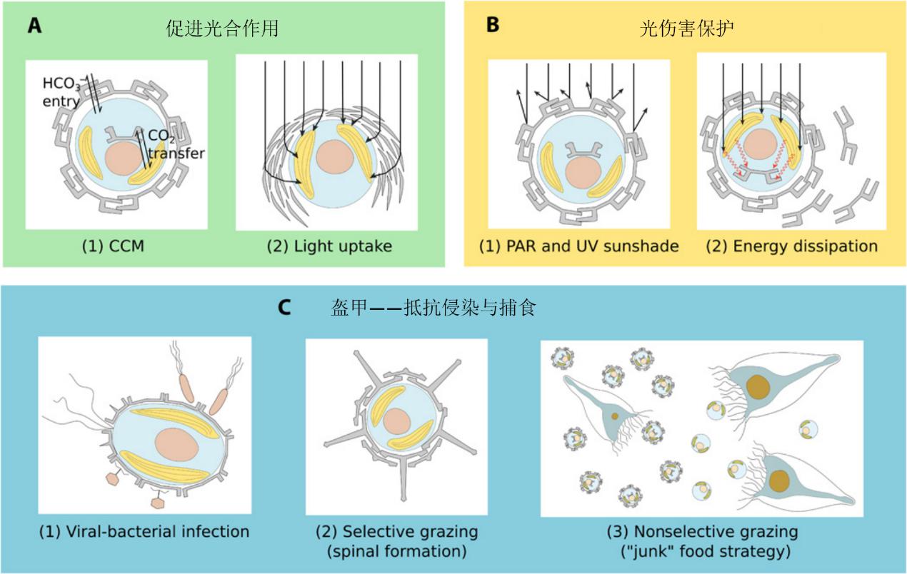 (2)光傷害保護。對于生活在上層海水的顆石藻而言,鈣化具有保護細胞免受光傷害的功能。強光條件時,顆石鈣板的存在可以為細胞擋光(尤其是紫外光)或者散發(fā)掉能量,而且細胞表面顆石層的數(shù)量還會根據(jù)紫外的強弱進行調(diào)節(jié)。