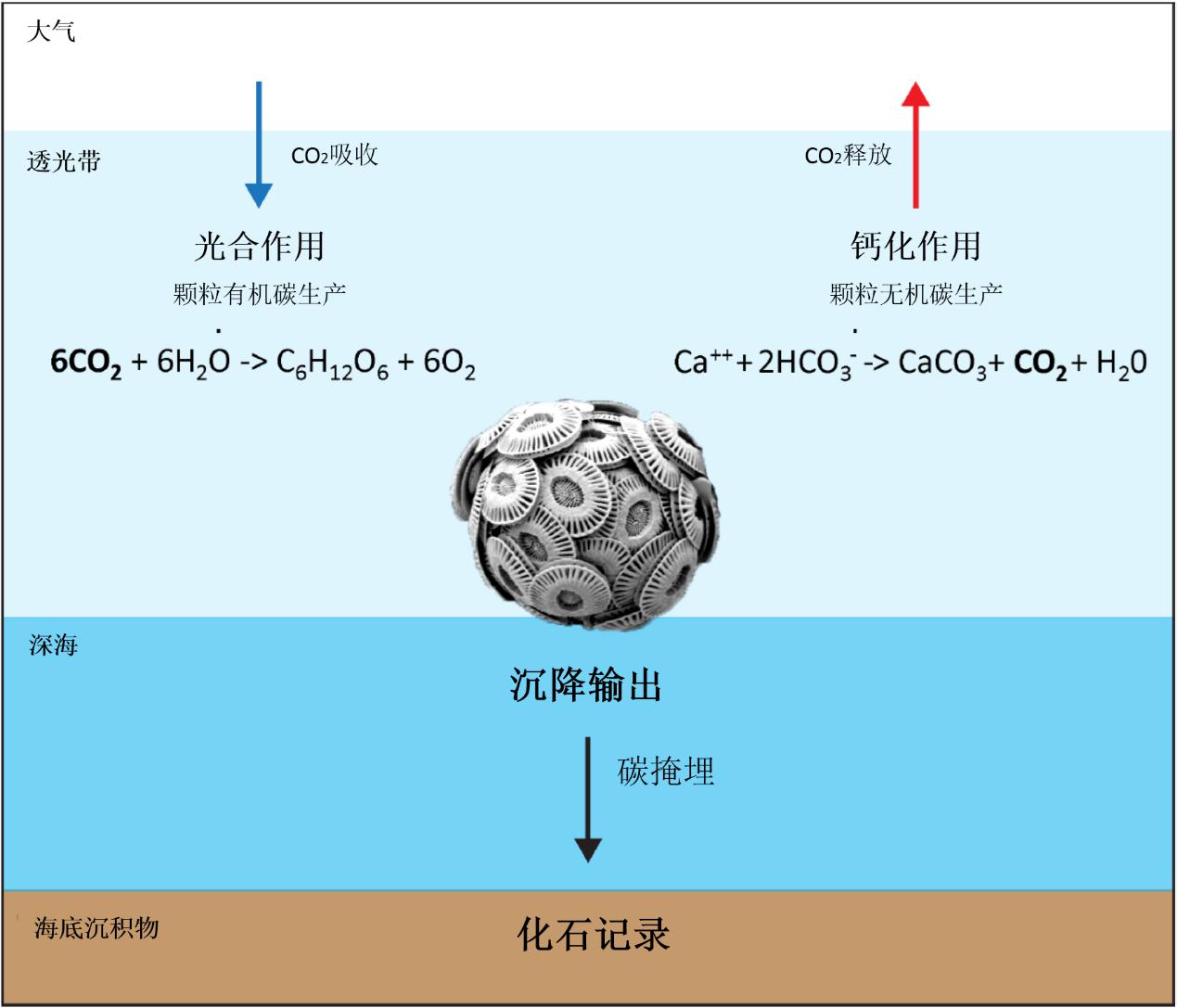 顆石藻是在上層海洋的光合作用區(qū)域內(nèi)對CO2的光合作用起到貢獻,以及將有機物質(zhì)排入到深海中,這就導致了海洋中CO2的吸收,被稱為有機碳泵(輸入海洋)。另一方面,碳酸鈣的生物生產(chǎn)和排放抵消了CO2的光合作用通過改變海洋碳酸鹽系統(tǒng)來實現(xiàn)CO2的凈釋放,成為無機碳反向泵(輸出到大氣)。輸出的無機碳和輸入的有機碳降雨的比率(Cinorg/Corg)稱為“Rain ratio”(降雨率?)。生物界的部分物質(zhì)會被重新“喚醒”,在海洋中浮游植物也會再次出現(xiàn)。從上層到深海的CO2的強度是由“Rain ratio”所影響的,因此,通過將碳排放到深海,“Rain ratio”改變了大氣與海洋表面的CO2濃度。顆石藻在“Rain ratio”中扮演著重要的角色,不僅是因為生產(chǎn)有機顆粒和無機碳,還因為其高密度的顆石(方解石)產(chǎn)生的壓艙石效應。方解石豐富的顆粒在沉積速度和沉積速度提升的同時,還可以在深海中沉積。因此,鈣質(zhì)的“海雪”可能會增加有機碳泵的強度。