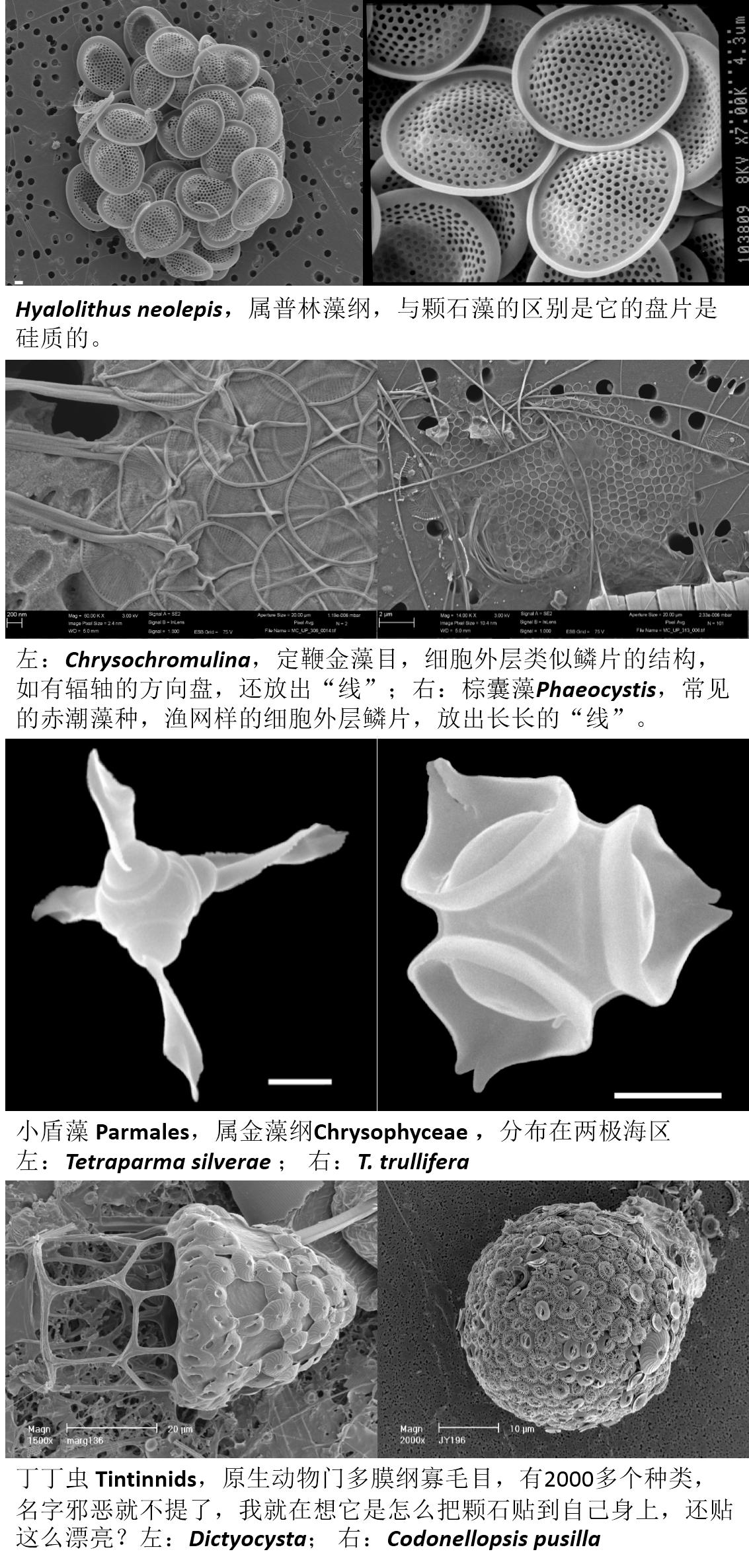 海洋中,除了顆石藻,有孔蟲、甲藻和硅藻之外,還有些類別的藻類或者浮游動物也有類似的披甲帶殼的現(xiàn)象,這些生物的礦化或帶殼功能如何進化得來,相互間又有什么關系,尚屬懸念。本文就放幾個圖片,讓大家稍微了解下,誰讓它們長得漂亮呢?