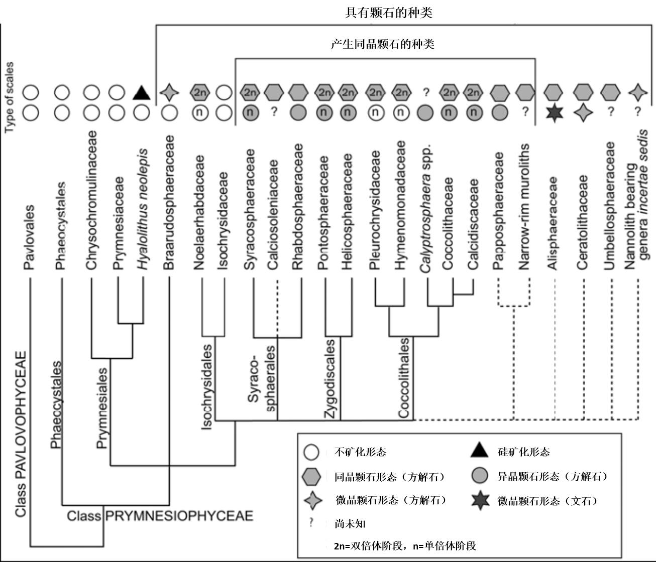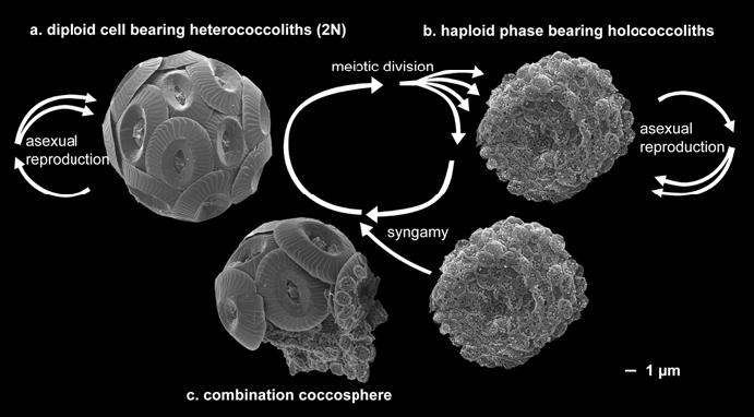 圖9.?異晶和同晶顆石經(jīng)常在同一種顆石藻中出現(xiàn),通常異晶顆石是二倍體階段的表型,而同晶顆石是單倍體階段的表型,而且兩種顆石可能出現(xiàn)在同一個細胞中(單倍體階段)。