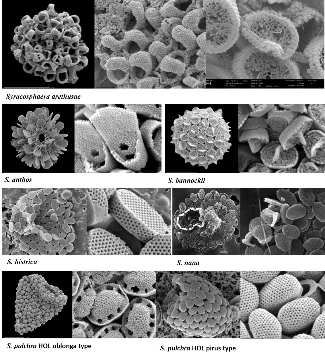 圖5. 以屬Syracosphaera的幾個種為例子,同晶顆石的顆粒特別明顯