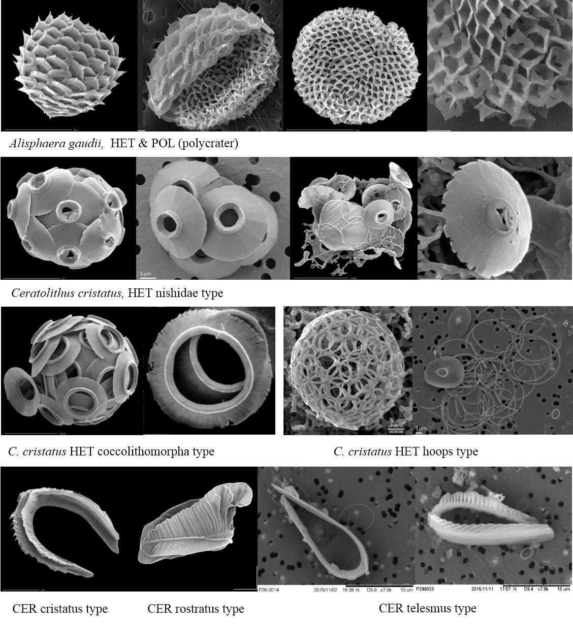圖7.?還有些顆石(球)不容易歸類,如Alisphaera gaudii,?有異晶顆石的表型,還有種表型似密集的火山口狀(polycrater,POL,文石而非方解石)。又如Ceratolithus cristatus,異晶顆石就有三種類型(西田?nishidae, 顆石翼狀coccolithomorpha和箍形hoops),而該屬還有一種馬鞍形顆石(Ceratoliths, CER, 屬微晶顆石?)