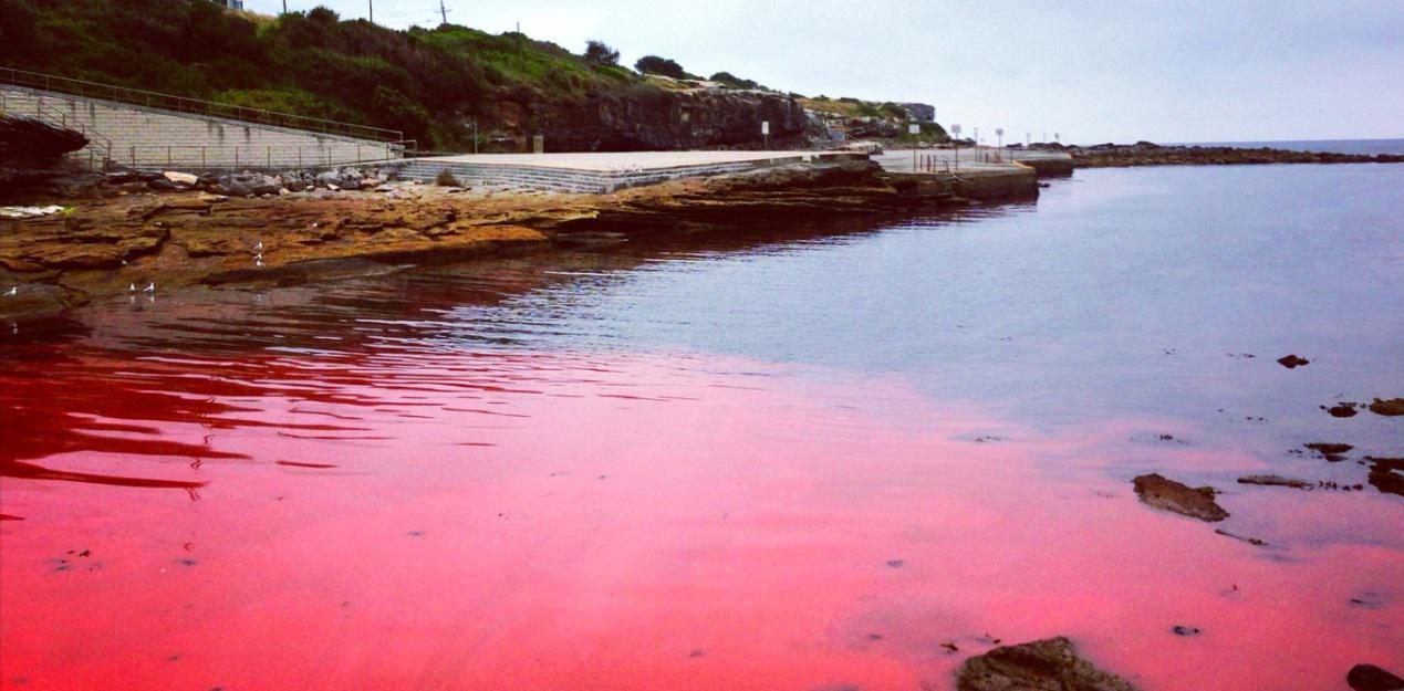 圖4. 在適宜營養(yǎng)及環(huán)境因子具備的情況下,自然水域經(jīng)常見到各色藻華。(澳大利亞Clovelly Beach,由夜光蟲形成的藻華)