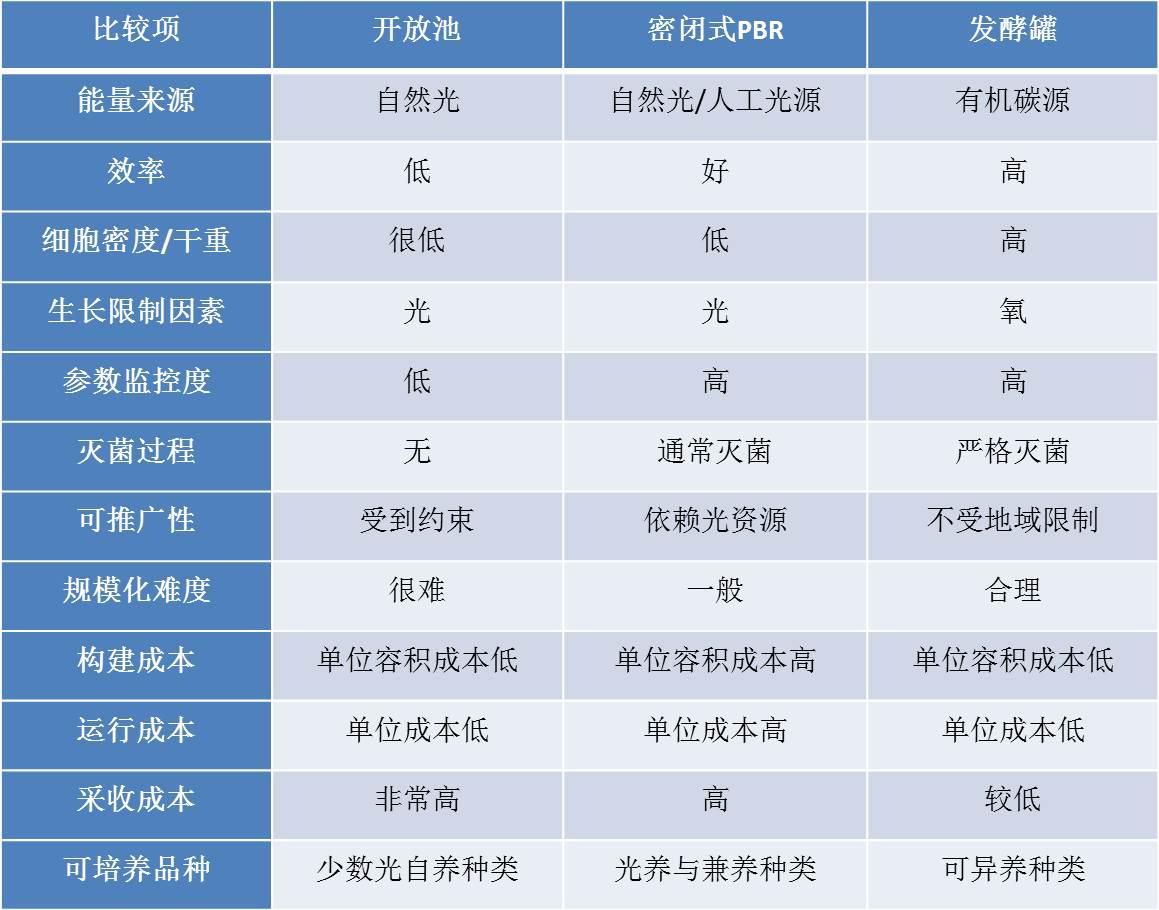 表1..不同微藻生產(chǎn)系統(tǒng)的比較