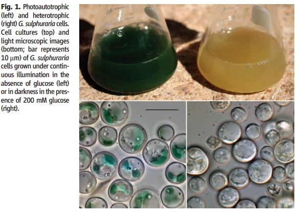 這三種藻的營養(yǎng)方式與其生境可以對應(yīng)起來, C.caldariumC. merolae主要是在巖石表面發(fā)現(xiàn)的,而G. sulphuraria則是從巖石更內(nèi)層中分離出來,這個部位陽光穿透不足,迫使細(xì)胞轉(zhuǎn)向異養(yǎng)。