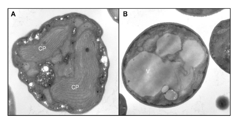 圖11. 光養(yǎng)(A)和異養(yǎng)(B)條件下G. sulphuraria 細(xì)胞電鏡照片,可以觀察到異養(yǎng)條件下葉綠體(CP)的缺失,轉(zhuǎn)化為前質(zhì)體,并出現(xiàn)個大液泡(V),(Martínez García,  2017)
