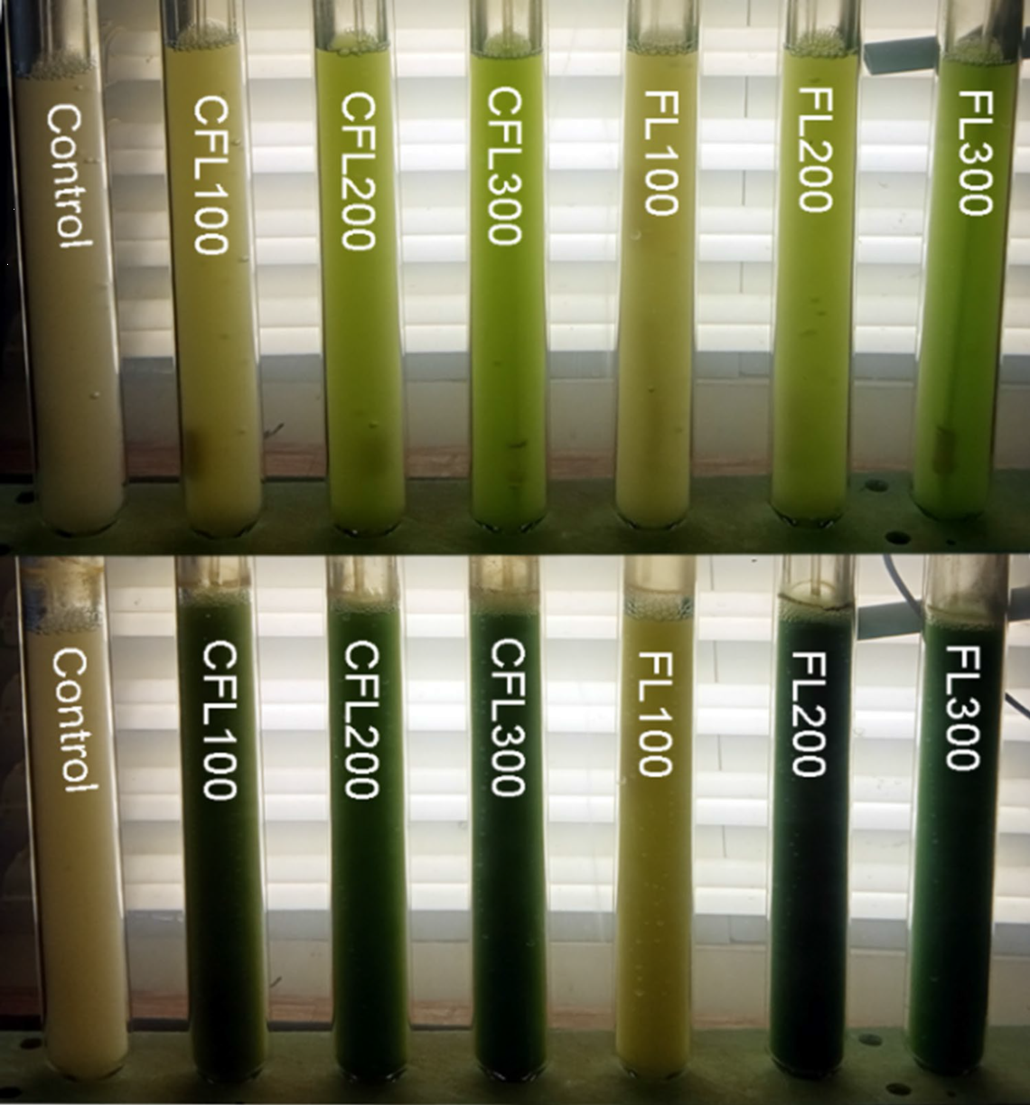 G. phlegrea,利用實驗光反應(yīng)器(立管)為裝置,添加1%甘油進(jìn)行兼養(yǎng),發(fā)光物質(zhì)添加量分別為100/200/300mg/L,上圖為培養(yǎng)2天的情況,下圖為培養(yǎng)5天的結(jié)果,