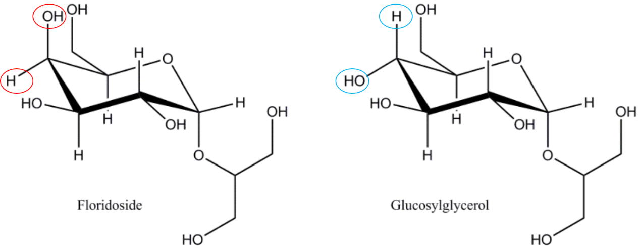 佛羅里達(dá)苷/甘油半乳糖苷(2-O-α-D-galactopyranosylglycerol)和甘油葡萄糖苷(2-O-α-D-glucopyranosylglycerol),注意佛羅里達(dá)苷與甘油葡萄糖苷在分子構(gòu)象上的差異,佛羅里達(dá)苷是紅藻光合作用的主要產(chǎn)物,佛羅里達(dá)苷是紅藻為動態(tài)碳庫,在同化為多糖分子(淀粉/糖原/細(xì)胞壁多糖)之前被暫時存儲。