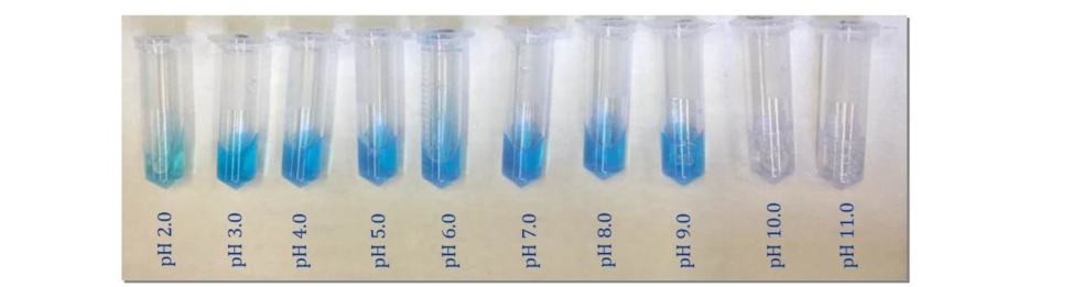 不同pH值下,G. sulphuraria藻藍(lán)蛋白的顯色情況,脫色主要原因為發(fā)色團(tuán)脫落(Ferrar et al., 2018)