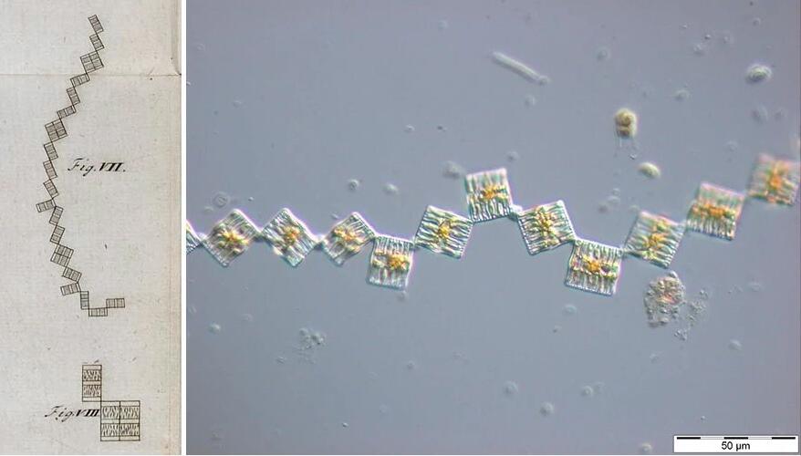最早的硅藻插畫(左)和現(xiàn)實(shí)中的平板藻(右)。左圖:Anonymous (1703).?Philos. Trans. R. Soc.?London.?23(288): 1494;右圖:EQAT?Phytoplankton