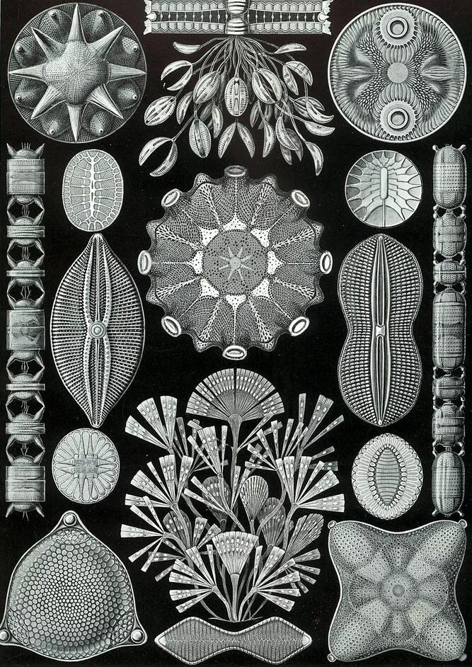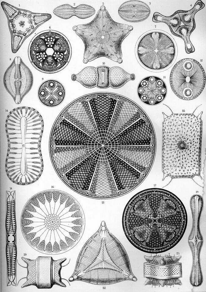 硅藻最早的科學(xué)記錄是100多年之后。1846年,荷蘭植物學(xué)家范登博世(R. B. van den Bosch)在他出版的澤蘭省藻類名錄中收錄了硅藻。而真正讓大家見識(shí)到硅藻之美的,還是恩斯特·??藸枺‥rnst Haeckel)在1904年出版的《自然界的藝術(shù)形態(tài)》——當(dāng)然,與此同時(shí),讓大家見識(shí)到的也有很多其他奇奇怪怪物種的美麗。