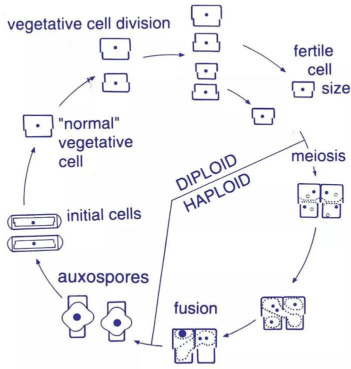然而,這樣的策略帶來的問題是,每次分裂,就會(huì)有一半的后代不可逆地變小一號(hào),幾代過后,一些運(yùn)氣差的硅藻,屋子可就小到?jīng)]法兒住了。這時(shí)候,它們就會(huì)不再繼續(xù)分裂,而是突然轉(zhuǎn)為有性繁殖,雌雄配子合體成為復(fù)大孢子,重新鑄造一個(gè)標(biāo)準(zhǔn)尺寸的外殼,繼而又重新開始進(jìn)入下一輪慢慢變小的歷程。