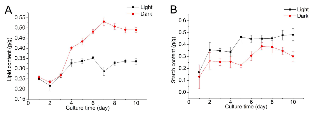 生長(zhǎng)在葡萄糖培養(yǎng)基中小球藻在光照及非光照情況下細(xì)胞油脂及淀粉含量隨時(shí)間變化圖