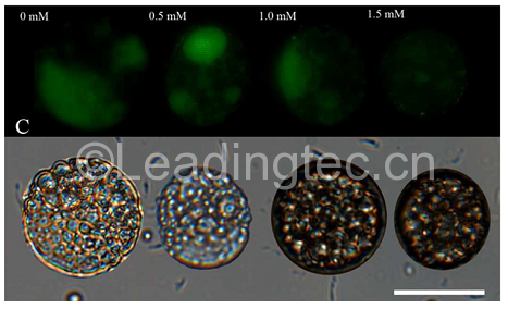 在不同芝麻酚濃度作用下隱甲藻細(xì)胞尼羅紅染色熒光(上)及白光(下)圖