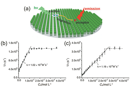 結(jié)果表明,在給受體組裝成的納米共晶中,能量傳遞過程符合激子遷移機制;受體臨界濃度對應(yīng)的兩個受體分子間的平均距離代表相干激子態(tài)的離域尺度。若以圓表示相干激子態(tài)的離域單元,該離域區(qū)域的半徑為6.1 nm,相應(yīng)的給受體分子的比例為1000:1。另外該人工模擬系統(tǒng)同樣具有很高的傳能效率:當給體受體的比例高達1000:1時,能量傳遞效率仍可達95%。論文(Angew. Chem. Int. Ed. 2016, 55, 275-2763)被選VIP文章。