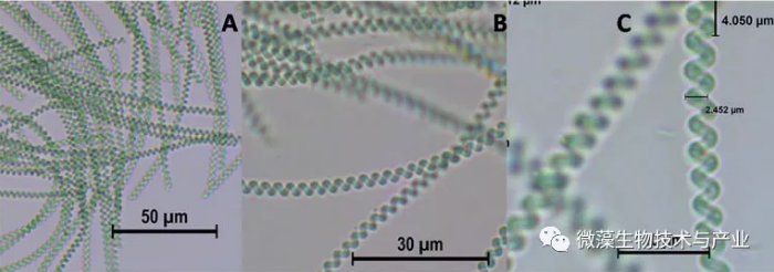 形態(tài)大?。郝菪蛑本€狀,藻體寬度2.5-16μm,螺旋直徑15-60μm,螺旋長度:0-80μm(注意:不同藻種之間,或同一藻種不同培養(yǎng)條件,這些參數(shù)變化較大)
