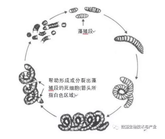 螺旋藻通過裂殖方式進(jìn)行繁殖,螺旋藻生長到一定階段,藻絲體中出現(xiàn)Necridia (幫助形成或分裂出藻碎片的死細(xì)胞),然后藻體多數(shù)在此處斷裂,形成藻體碎片(藻殖段),藻殖段逐漸分裂出新的細(xì)胞,延伸,形成螺旋,然后到一定時(shí)期,再斷裂出藻殖段,如此循環(huán),繁殖。
