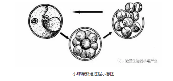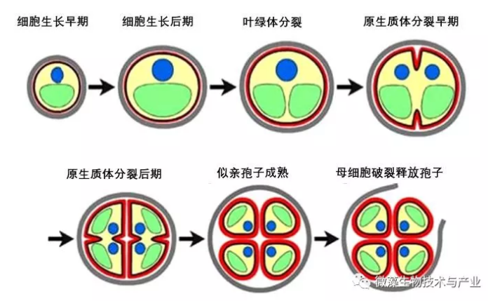 小球藻通過無性生殖進(jìn)行繁衍。簡(jiǎn)單來說,母細(xì)胞內(nèi)出現(xiàn)多個(gè)似親孢子(autospore),然后母細(xì)胞破裂,釋放多個(gè)似親孢子。然后,這些似親孢子生長,待成熟后再通過上述一樣的方式進(jìn)行繁衍,如此循環(huán)。母細(xì)胞內(nèi)的孢子數(shù)一般在2~16個(gè)之間。