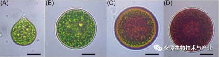 雨生紅球藻處于不同階段的細(xì)胞狀態(tài)