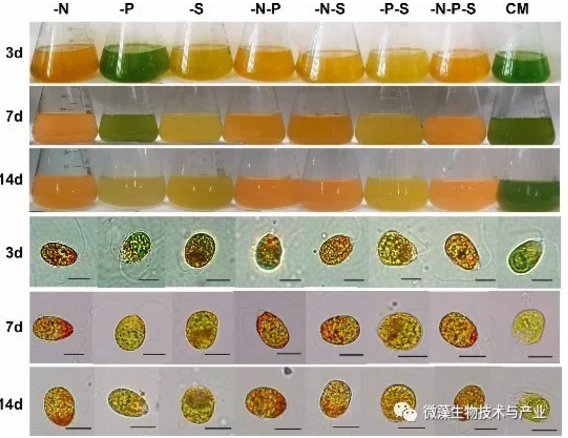 不同營養(yǎng)饑餓條件下的培養(yǎng)過程及細(xì)胞變化(Source: Hexin Lv et al,Analysis of the Physiological and Molecular Responses of?Dunaliella salina?to Macronutrient Deprivation,Plos one, 2016)