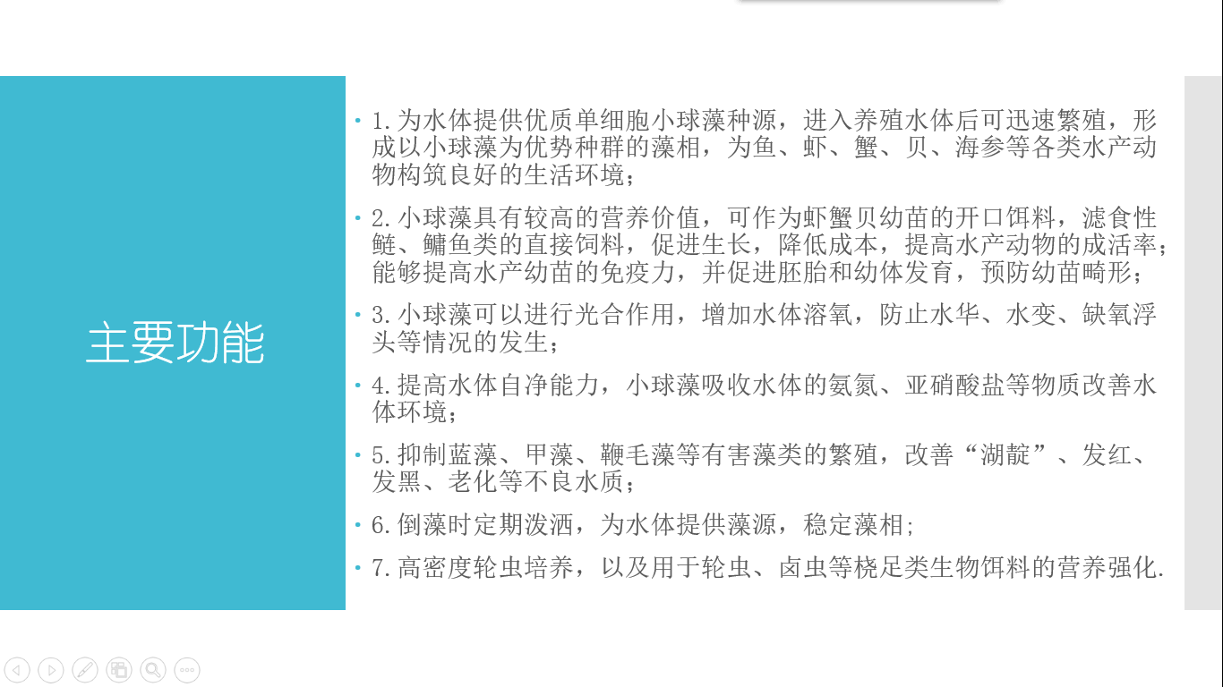 2、提高光合作用能力,調(diào)節(jié)水色,改良水質(zhì)。