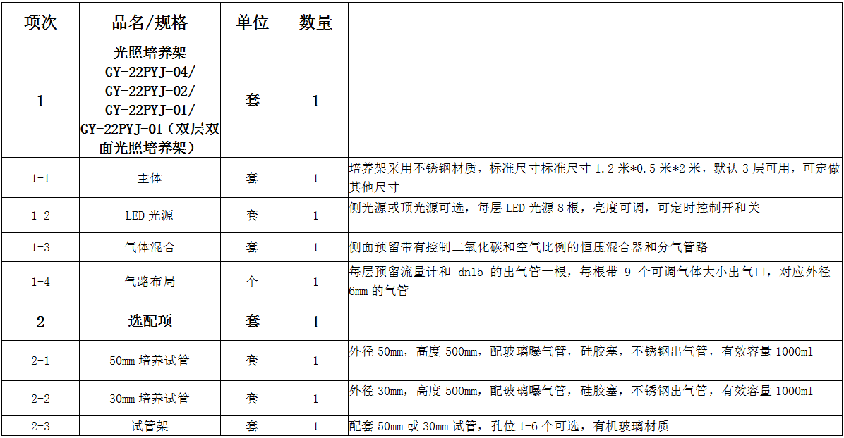 1、培養(yǎng)試管,石英玻璃材質(zhì),直徑30mm或者50mm,高度600mm,對(duì)應(yīng)容量500ml或者1000ml,配套耐高溫硅膠和0.9mm內(nèi)徑的毛細(xì)曝氣管一根
