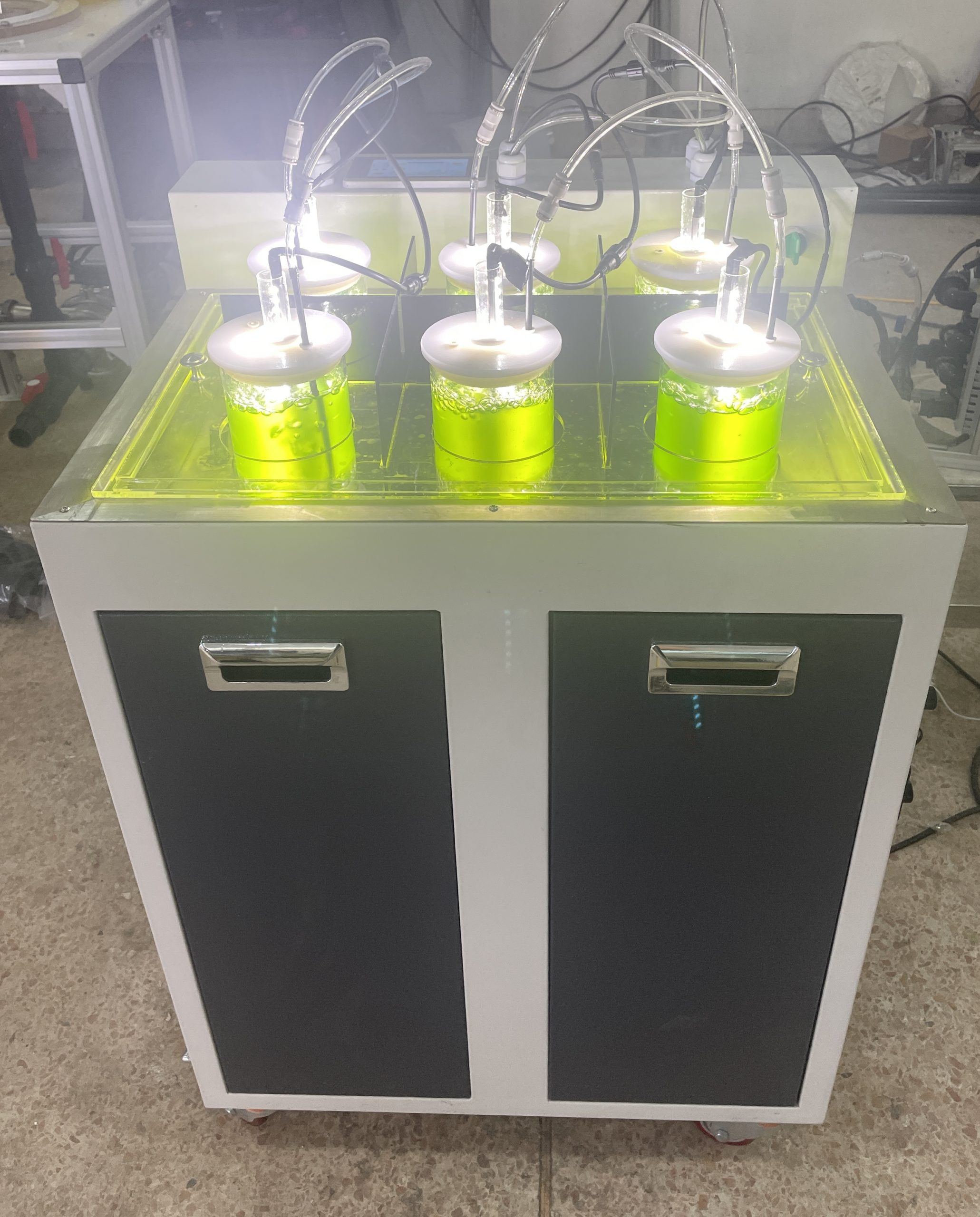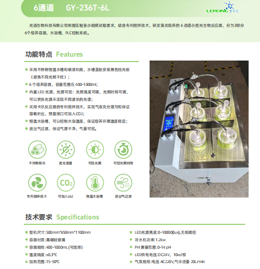 光語生物科技有限公司根據(jù)實驗室小規(guī)模試驗要求,結(jié)合專利攪拌技術(shù),研發(fā)藻類培養(yǎng)的6通道小型光生物反應(yīng)器,分為3部分:6個培養(yǎng)容器,水浴槽,PLC控制系統(tǒng)。