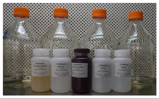 濃縮液采用SIGMA試劑和MILLIQ水配制,萬(wàn)級(jí)潔凈室條件下,經(jīng)過(guò)0.22μm密理博PC濾膜抽濾2次,高壓滅菌(不能高壓滅菌的試劑增加一次手動(dòng)抽濾)。然后用0.2μm密理博濾頭手動(dòng)抽濾灌裝,做到更加潔凈無(wú)菌,正規(guī)標(biāo)簽??梢韵♂屌囵B(yǎng)200L藻液。