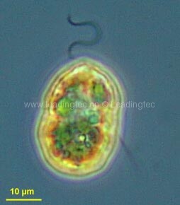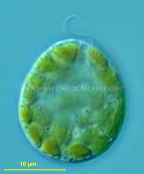 單細胞,略呈橢圓形,長約8~25μm,寬約6~15μm。無細胞壁,由周質(zhì)膜包被。具兩條不等長的鞭毛。藻體活動時,鞭毛常彎曲或與細胞長軸成垂直伸出。每個細胞約有8~20個棕黃色的大盤狀色素體,無眼點,有許多無色透明的油粒。