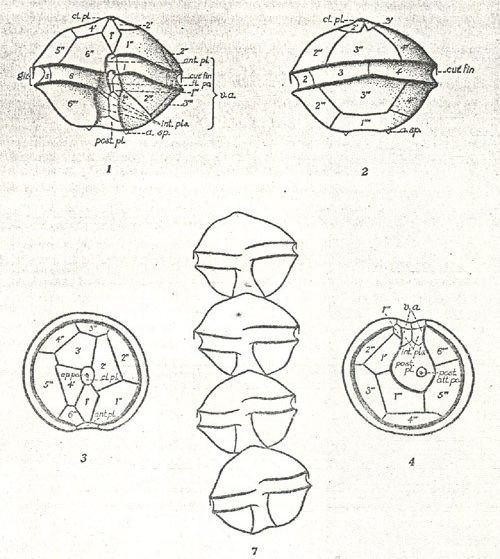 細胞球形,長略大于寬,上殼與下殼半球形,大小相近。橫溝位于中央,兩端位移與橫溝等寬,縱溝深,后溝較深。甲片薄,排列式為APC,4’,6”,6C,8s,5”’,2””??醉攺?fù)合結(jié)構(gòu)(APC)為三角形,有一大的魚鉤狀頂孔和一橢圓形的前連接孔(a.a.p)。后連接孔(p.a.p)位于后縱溝板的右側(cè),近邊緣處。前、后連接孔在細胞長成后常閉合,細胞無腹孔。細胞長29~30μm,寬31~33μm。細胞有時形成小于16個細胞的鏈,但長鏈易斷成2~4個細胞的短鏈。孢囊圓柱狀,表面光滑。