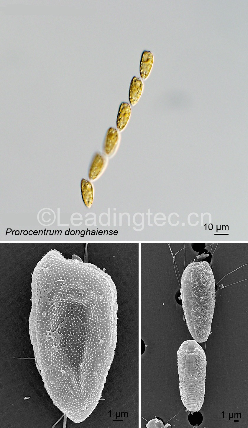 東海原甲藻與在日本、韓國等亞洲海域分布的被報(bào)道為Prorocentrum?dentatum的原甲藻以及來自美國CCMP的具齒原甲藻(Prorocentrum?dentatum?)為同一種。東海原甲藻是一種喜長光照的赤潮藻類,其生長的最適溫度為22?℃,最適鹽度為25~31。東海原甲藻能利用銨鹽、硝酸鹽和亞硝酸鹽,最適生長的w(N)/w(P)比范圍在8~20之間。
