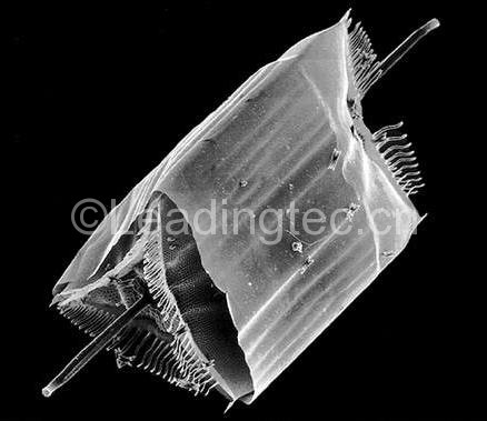 單細(xì)胞,形狀為三角柱形,近于圓柱形或方柱形。細(xì)胞寬25-60微米,高98-190微米,通常高為寬的2-3倍或更長。殼面扁平,大多為三角形,中央有中空的大刺。細(xì)胞壁薄,色素體多數(shù),呈顆粒狀,同時(shí),藻細(xì)胞獨(dú)立生活不會(huì)連接成串,細(xì)胞中綠色的小點(diǎn)是它的葉綠體。布氏雙尾藻適溫范圍廣,屬世界性種類,也是我國沿海常見中之一。我國四大海區(qū)均有記錄。