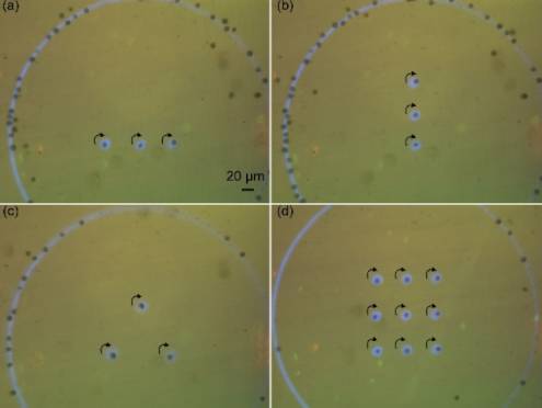 此次獲Lab on a Chip封面刊載的論文,論述了微納米課題組在前期控制藻類細(xì)胞沿任意設(shè)定路線游動的基礎(chǔ)上,進一步實現(xiàn)了藻類細(xì)胞的陣列化旋轉(zhuǎn)。結(jié)合光誘導(dǎo)介電泳技術(shù)(ODEP),建立了藻類細(xì)胞在ODEP微環(huán)境中的轉(zhuǎn)動狀態(tài)模型和受力模型,實現(xiàn)了對藻類細(xì)胞的快速捕獲及陣列化旋轉(zhuǎn),且通過改變光強可有效調(diào)節(jié)細(xì)胞旋轉(zhuǎn)速度。構(gòu)建的藻類細(xì)胞旋轉(zhuǎn)陣列有望作為微尺度馬達陣列,在微流控及生物驅(qū)動領(lǐng)域發(fā)揮重要作用。