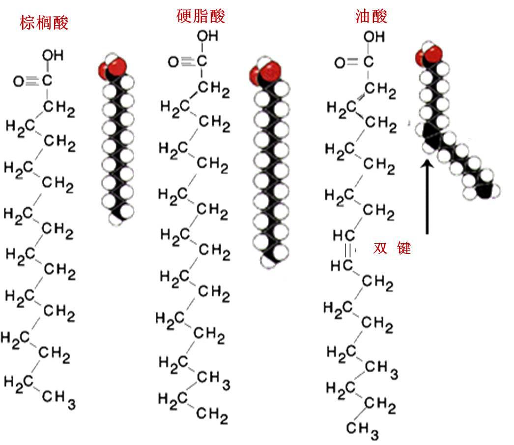 再來補充一個知識點,繼續(xù)上圖。脂肪酸在動植物細胞內(nèi),通常和甘油結合,三個脂肪酸分子和一個甘油分子形成一個甘油三酯(圖5),我們平時吃的動物油植物油,就是甘油三酯,甘油三酯通常形成油包,存在于動物的脂肪細胞(肥膘啊)或者植物的種子里(大豆、花生仁)。如果油中飽和脂肪酸含量高,常溫下油就會凝結,比如各種動物油,而植物油中不飽和的脂肪酸含量稍高,常溫下就不容易凝結。(很好解釋,飽和的脂肪酸形狀有規(guī)律,就像一塊塊規(guī)整的磚頭,容易摞一起,而不飽和的脂肪酸彎彎曲的,一塊塊不規(guī)整的石頭,不容易摞一起)。