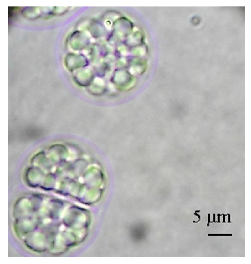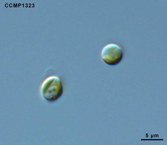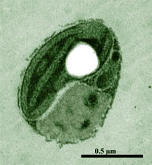 圖11. 綠色游藻,個頭小,不到一微米直徑,年代久遠,印象中是第一個被破獲基因組的微藻種類(這個照片是藻被切成了片了,藻也逃不過被切片的命啊,呵呵)。