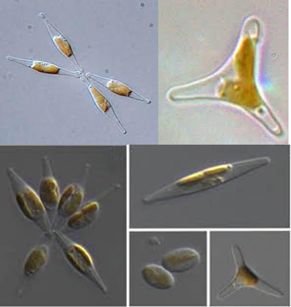 圖13.三角褐指藻,這個藻在水產(chǎn)養(yǎng)殖中經(jīng)常用,尤其是用來養(yǎng)蝦苗貝苗等,名字里帶了三角兩字,不過它也經(jīng)常有不是三角的模樣,梭狀、卵圓形都有。