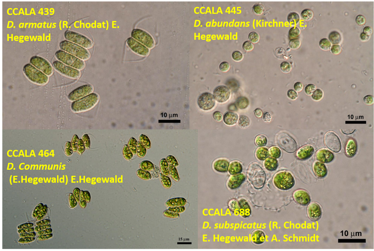 我們通常的印象里,柵藻(廣義上的,即包括柵藻屬Scenedesmus和鏈帶藻屬Desmodesmus)是四個細胞一個克隆(聯(lián)生體),而實際上,很多種存在單細胞的形式。尤其鏈帶藻屬下,因芒刺的存在,會阻礙多個細胞形成聯(lián)合而形成單個細胞形式;也會因為繁殖時多個子細胞形成的克隆分散展開而形成單個細胞形式(一個克隆可分散為多個子體,細胞數(shù)可能不同)。無芒刺的柵藻屬單細胞形式形成更傾向后者方式。